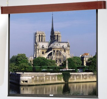 Best1 Designer with Matte White fabric, Natural Walnut Veneer Concord Case and 110 volt motor. . Wood Encased Electric Screen. Great for any room, especially home theater where aesthetics are important. Mounts either to wall or ceiling. . Choose from six contemporary and traditional case designs. All covered in your choice of seven real wood veneers (except the Cambridge, which is available in your choice of three laminates). Patented in-the-roller motor mounting system for quiet operation. . Matte White is one of the most versatile screen surfaces and a good choice for situations when presentation material is being projected and ambient light is controllable. Its surface evenly distributes light over a wide viewing area. Colors remain bright and life-like, with no shifts in hue. Gain 1.0 with a 50-degree viewing half angle. . review