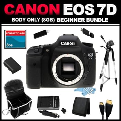 ***Included in your Canon EOS 7D SLR Digital Camera (Body Only) (8GB Beginner Bundle Kit)***Canon EOS 7D SLR Digital Camera (Body Only)8GB (CF) CompactFlash Memory CardHigh quality and reliability.Memory Card WalletSafe storage for your memory cards.(All In One) SD/SDHC Card USB Reader/WriterHigh Speed. Easy plug and play. Use with SD/SDHC/microSD/MS Pro Duo/M2.BatteryLithium-Ion battery for your camera.Home/Car AC/DC ChargerCharge your battery at home and on the road. Smart LED indicator shows charging status.Camera Carrying CaseMedium carrying case. Includes shoulder strap.6' HDMI to HDMI Mini CableHigh-Definition signal up to 1080p57" Tripod Full Size Photo/Video TripodExtends to 57-Inch. 3 way pan head.***Also included in your kit***Bottle of Lens Cleaning Solution with 5 Cotton SwabsScratch Safe Cleaning Cloth3 LCD Screen GuardsSqueegee Card