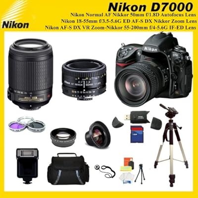 16.2MP DX-Format CMOS sensor that works together with Nikon's EXPEED 2 image processor, 1080p HD video with full time autofocus, 6FPS burst shooting, a 39-Point AF System, autofocus fine tuning, a 3" LCD display and pentaprism optical viewfinder, and dual SD/SDHC/SDXC memory card slots. Factory Supplied Accessories EN-EL15 Lithium-Ion Battery MH-25 QuickCharger Camera Strap USB Cable Audio Video Cable DK-5 Eyepiece Shield (Replacement) DK-21 Rubber Eyecup BM-11 LCD Monitor Cover BF-1B Body Cap BS-1 Hot-Shoe Cover ViewNX 2 CD-ROM User's Manual 1-Year Limited Warranty Sunset Electronics Package Includes Nikon D7000 16.2MP DX-Format CMOS Digital SLR with 3.0-Inch LCD (BLACK) Nikon 18-55mm f/3.5-5.6G ED AF-S DX Nikkor Zoom Lens Nikon AF-S DX VR Zoom-Nikkor 55-200mm f/4-5.6G IF-ED Lens Nikon Normal AF Nikkor 50mm f/1.8D Autofocus Lens 16GB Hi Speed Error Free SD Memory Card Hi Speed SD Card Reader Soft Carrying Case 0.45x Wide Angle Lens 2x Telephoto Lens 3 Piece Filter Kit (uv, cpl, fld) Dedicated Shoe Mount Flash Lens Cap Keeper Memory Card Wallet 50 inch Size Tripod LCD Screen Protectors Starter Kit Exclusive Sunset Electronics Cleaning Cloth