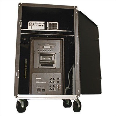 Multi-Media Security Presentation Cart with 80 Watt PA System Acoustic lens bends sound back out through the cart equipment door, towards the audience Built in patented tilt projector shelve Adjustable interior equipment shelf Integrated push / pull cut outs in top. 80 - Watt portable Public Address System - UHF DVD/CD Player: DVD, CD, MP3, VCD, CDR and CD-G Cassette Player / Recorder 2 - Wireless Microphones, Handheld and Lavaliere Built in Mixer that supports RCA audio LINE-IN/OUT 2 - ¼" wired mics line in 1 - RCA video output jack Tone and echo controls suitable for karaoke 2 - Eight inch full range speakers Built-in 3 piece 6V/7A rechargeable batteries Two Frequency's include 806.3 & 812.8 or 854.9 & 864.9 On wheels with a pull