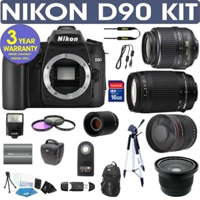 Best1 Includes Refurbished Nikon D90 Digital SLR Camera Body with 3 Year Celltime Warranty Repair Contract . Nikon 18-55mm VR Lens + Nikon 70-300mm Lens + .40x Wide Angle Fisheye Lens + 800mm Mirror Lens + 2x T-Mount Telephoto Lens + 16 GB Memory Card . 3 Piece Filter Kit (UV Filter + PL Filter + FLD Filter) + Camera Backpack + Camera Holster Case + Slave Flash + High Speed Card Reader + Wireless Remote + Extra Rechargeable Battery + 57" Professional Tripod . 6 Piece Starter Kit includes a mini travel tripod, 3 piece screen protector, memory card wallet, lens cleaning fluid, soft-tex fiber cloth, and 5 piece cotton swabs . 3 Year Celltime Warranty Repair Package . review