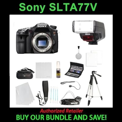 Step up to an incredible shooting experience with this 77 DSLR camera. Featuring Sony's top-of-the-line Translucent Mirror Technology, you can focus and shoot simultaneously for fast, precise performance and continuous shooting of up to 12 frames per second, complete with continuous auto focus. Capture amazingly-detailed images that make for gorgeous enlargements thanks to an impressive 24.3-megapixel sensor. The world's first DSLR to offer a choice of super-smooth 60p, standard 60i or richly cinematic 24p movie modes all at Full HD 1920 x 1080 resolution, you can capture incredible, high quality AVCHD or MP4 videos of all your memorable moments (records in 29-minute segments). A Tru-Finder OLED electronic viewfinder offers remarkable resolution and high contrast for outstanding depth, plus allows you to view setting adjustments in real time for the best possible picture. with This great bundle comes with full size DSLR bag, tripod carrying case, cap keeper, memory wallet, DSLR neoprene strap, microfiber cloth, professional 50 inch tripod, LCD cleaning solution, blow brush, cotton swabs, lens tissue, and LCD screen protector.and The Bower Illuminator Dedicated Flash for Sony Cameras. the Illuminator is a dedicated TTL flash for use with SONY ALPHA SLR cameras. The Illuminator features a guide number of 99' - 100 ISO and a tilt head that operates from 0 to 90. Fast 4 second Recycling time. A built-in slave mode provides a useful remote flash capability that can help eliminate shadows and over-saturated subjects. The flash covers an 18-55mm range in 35mm full-frame format and also offers red-eye reduction, automatic shutter speed setting, and rear curtain synchronization for shooting at slower shutter speeds. The Illuminator is powered by 4 AA batteries.