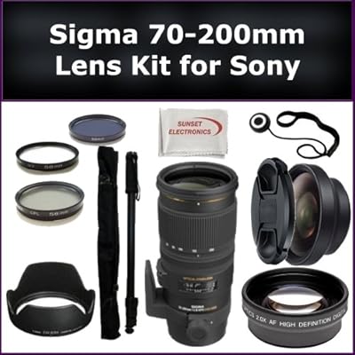 This Ultimate Sigma 70-200mm f/2.8 EX DG APO OS HSM Lens + Accessory Kit for Sony Includes:- Sigma 70-200mm f/2.8 EX DG APO OS HSM Lens- 0.45X Wide Angle Lens- 2X Telephoto Lens- Lens Cap- Lens Hood- Lens Cap Keeper- Monopod- 3 Piece Filter Kit (UV, FLD, CPL)- Microfiber Cleaning Cloth