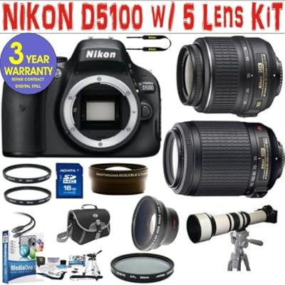 Best1 Includes BRAND NEW Nikon D5100 Digital SLR Camera Body (Includes manufacturer's supplied accessories) . Nikon 18-55mm VR Lens + Nikon 55-200mm VR Lens (110-400mm zoom) + 650-1300 SUPER ZOOM LENS + 2x Lens (double up to 400mm) + .45x Super Wide Angle Lens . 16 GIG SD Memory Card + 2 UV Filters + PL Filter + Camera Case + HDMI Cable . 11 in 1 Digital & Video Camera Kit (50" tripod w/ case, shoulder strap, universal screen protector, 5 cotton swabs, soft-tex fiber cloth, cleaning liquid, blower brush, lens tissue, 110/220 volt adapter) . Corel MediaOne Plus Photo Editing Software + 3 Year Celltime Warranty Repair Package . review