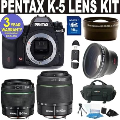 Best1 Pentax K-5 Digital SLR 16.3 - megapixel CMOS sensor -1080p HD video at 25 FPS - fully weather-sealed and coldproof design . PENTAX 18-55mm f/3.5-5.6 AL WR (Weather Resistant) Lens - covering a wide to moderate wide-angle - focal length equivalent to 27mm to 82.5mm in the 35mm format . Pentax 50-200mm F/4-5.6 AL (WR Weather Resistant) Lens - 4X zoom coverage in the telephoto range - Quick-Shift Focus System allows instant switching from autofocus to manual focus operation . Wide Angle Lens - 2x Telephoto Lens - 16 GIG High Speed Memory Card - Holster Case - Memory Card Reader . 6 Piece Starter Kit includes a mini travel tripod, 3 piece screen protector, memory card wallet, lens cleaning fluid, soft-tex fiber cloth and 5 piece cotton swabs. - 3 Year Celltime Warranty . review