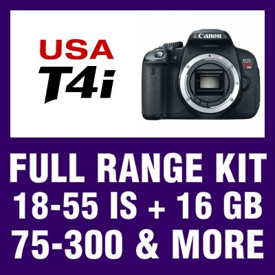 Canon EOS Rebel T4i - 650D Camera Body The Canon EOS Rebel T4i Digital Camera is the most sophisticated Rebel yet. It is an ideal camera for any level photographer. The new Rebel T4i delivers phenomenal image quality, high performance, and fast, intuitive operation. This 18.0 megapixel DSLR features an APS-C-sized CMOS sensor and a DIGIC 5 image processor for fast operation and tremendous low light performance to an expanded ISO of 25600. Full HD 1080p video is supported and features a full-time Movie Servo AF system for continuous auto focusing while using live view to record movies. A 3.0" Vari-angle touch screen LCD is incorporated and flips out and tilts for viewing from a wide variety of angles. br> The Rebel T4i is compatible with SD/SDHC/SDXC memory cards and Canon's full line of EF and EF-S lenses. Items Included in this Kit: ? Canon EOS Rebel T4i - 650D Camera Body ? Canon 18-55mm f/3.5-5.6 EF-S IS Image Stabilizer Lens ? Canon 75-300mm f/4-5.6 III EF Lens ? 500mm f/8.0 Preset Telephoto Lens for SLR ? 650-1300mm Long Range General Brand Lens ? 16 GB Secure Digital (SD) Memory Card ? 58mm Wide Angle Lens ? 58mm 2X Telephoto Lens ? Large Backpack for SLR Camera Equipment ? Holster case for SLR camera and zoom lens ? 58mm 3 Filters Kit: UV - Polarizer - FLD ? 58mm UV Filters - 2 units ? DSLR/Camcorder Tripod with 3-Way Pan Head 3-Section Leg and Quick leverlock ? Power Auto Digital Flash Clip-On and Slave ? T-Mount for Canon DSLR ? Mini Travel Tripod ? USB 2.0 High Speed SecureDigitalTM Card Reader ? Memory Card Wallet ? LCD Screen Protectors ? Lens Cleaning Kit ? Lens Cap Holder ? Canon T4i mfg items