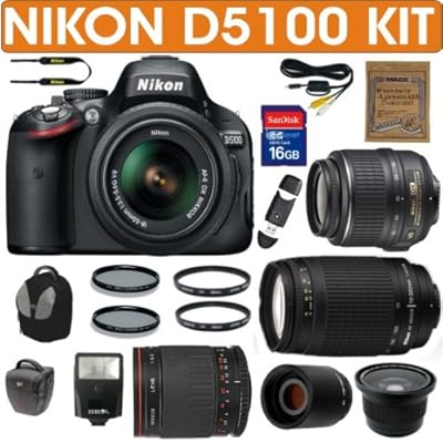 1. Nikon D5100 16.2MP Digital Camera (IMPORT)2. Nikon 18-5mm VR Lens3. Nikon 70-300mm G Zoom Lens4. Vivitar 500mm Mirror Lens5. 2x Teleconverter Lens (up to 1000mm)6. .40x Super Wide Angle Fisheye Lens7. 16 GIG High Speed Memory Card - Class 108. 52mm UV Filter + 52mm CPL Filter9. 62mm UV Filter + 62mm CPL Filter10. Vivitar Backpack Case11. Holster Case12. Zeikos Slave Flash13. USB Card Reader14. CELLTIME Cleaning Kit15. MACK 3 YEAR WORLDWIDE WARRANTY