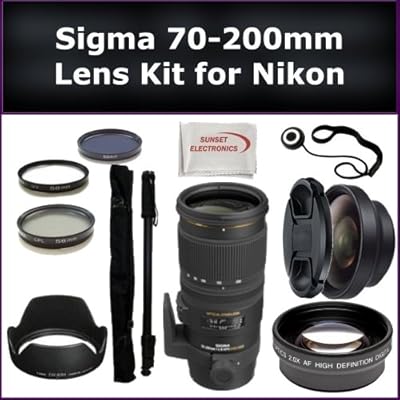 This Ultimate Sigma 70-200mm f/2.8 EX DG APO OS HSM Lens + Accessory Kit for Nikon Includes:- Sigma 70-200mm f/2.8 EX DG APO OS HSM Lens- 0.45X Wide Angle Lens- 2X Telephoto Lens- Lens Cap- Lens Hood- Lens Cap Keeper- Monopod- 3 Piece Filter Kit (UV, FLD, CPL)- Microfiber Cleaning Cloth