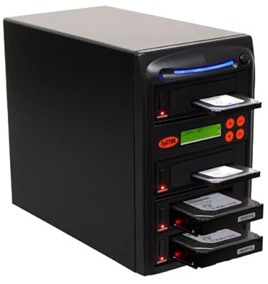 The Systor 1 to 5 Hard Drive / Solid State Drive (HDD/SSD) 100MB/sec Transfer Rate - Hot-Swappable Dual Port. Fits both 2.5" & 3.5" Hard Disk Drive without using an adapter. Tower duplicator easily copies any type of file on your SATA hard disk drive with quick and complete accuracy. Regardless of whether the disk drive environment is in Unix, Linux, Windows, or Macintosh platforms, the copy tower will accurately clone your hard disk at a stable and steady rate. Accurate disk reproduction is provided for all formats, such as FAT 16/32 or NTFS formatted. A new feature to the hard drive duplicator is the 3D LED status lights. This allows the user to keep track of their drives without having to be right in front of the workstation. The stylish all-black door has built in vents for optimal cooling and air flow to keep your drives running at their best. To further enhance the cooling, included is a rear outtake fan on each drive. Complete standalone duplicator, NO software or computer required, Built for continuous burning, NO cool down time required.